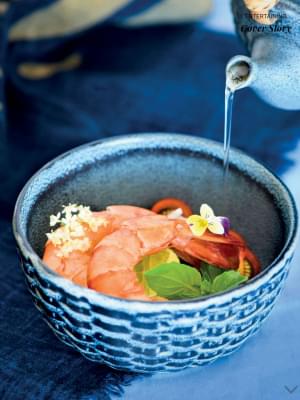 Double-boiled french spring chicken soup with black tiger’s paw mushroom and conpoy